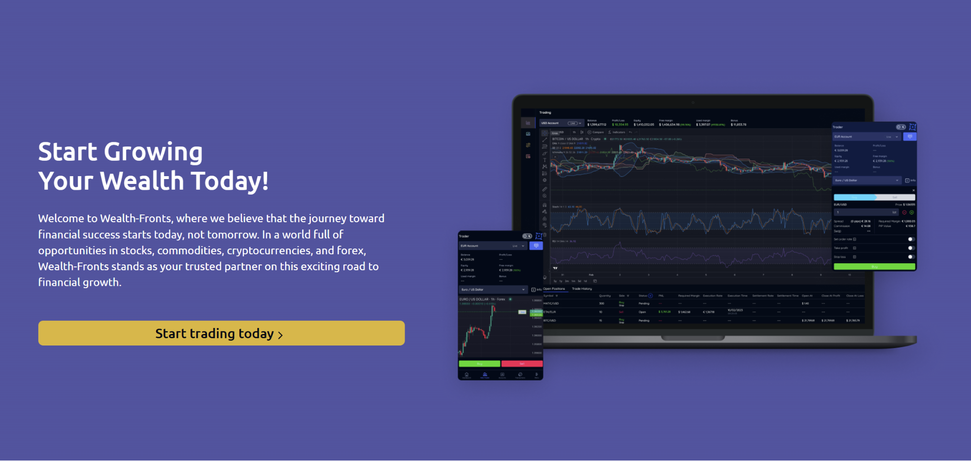 Sometimes the first glance at a broker’s website already hints at the kind of experience it is trying to offer. In the case of Wealth Fronts, the presentation leans toward a modern trading environment, with visuals centered around charts and multi-device access.